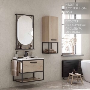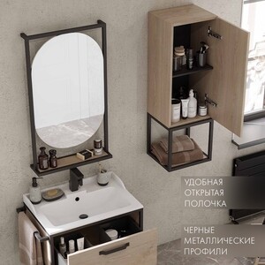 Зеркало Лофт Фабрик отличается необычным оригинальным дизайном и удобным функционалом. Черные металлические профили в форме прямоугольника обрамляют овальное зеркало, под которым находится полочка из влагостойкой ламинированной плиты в цвете Дуб Эндгрейн. Открытая полочка удобна для косметических и декоративных мелочей, которые всегда должны быть под рукой.