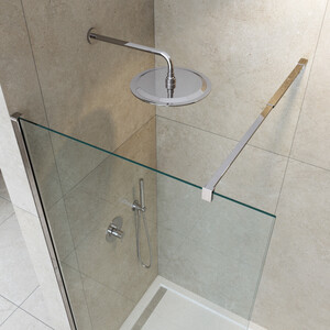 Неподвижная душевая перегородка, предназначенная для создания душевой зоны. Исполнение стекла прозрачное. Толщина безопасного закаленного стекла 8 мм. Оригинальный телескопический кронштейн позволяет регулировать ширину душевой зоны (и входа) в диапазоне 75 – 120 см.