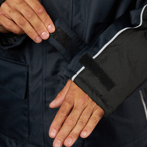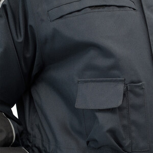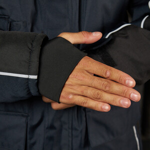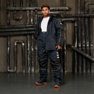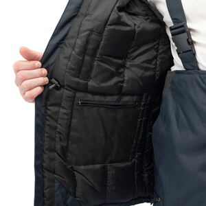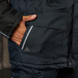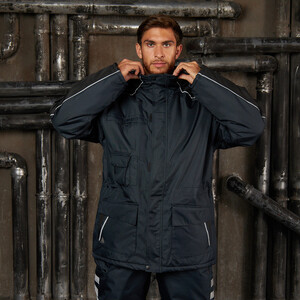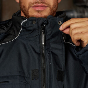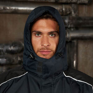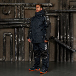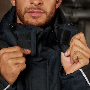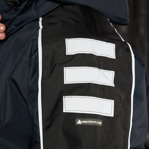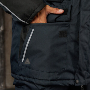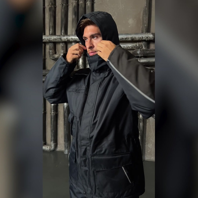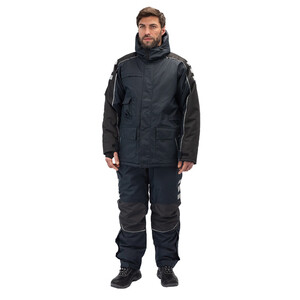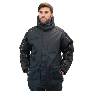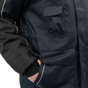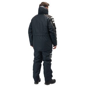 Утепленная влагонепроницаемая куртка-парка прямого силуэта, с центральной двухзамковой застежкой-молнией, закрываемой ветрозащитным клапаном с помощью контактной ленты и кнопок, воротником-стойкой, с отстегивающимся капюшоном. Влагонепроницаемые швы. Утепленный капюшон пристегивают к куртке с помощью замка-молнии, длина лицевого выреза капюшона регулируется с помощью шнура и фиксаторов, объем – хлястиком с застежкой на контактную ленту. Воротник изнутри отделан флисом. Ширину куртки по низу регулируют с помощью эластичного шнура. Эластичная вставка в области пояса. Рукава втачные с локтевым швом, с трикотажными манжетами, низ рукава регулируется с помощью хлястика на контактной ленте. На передней нижней части куртки расположены 2 накладных кармана, закрываемым на клапан с помощью контактной ленты; на накладных карманах расположены прорезные с наклонным входом. На правой стороне груди – прорезной карман с горизонтальным входом. Ниже расположен карман для ручки и накладной карман с клапаном на контактной ленте. 2 внутренних кармана: карман для ручки и карман на молнии. На рукавах и нижних накладных карманах – нашивки из светоотражающей ленты. Куртка предназначена для обеспечения надежной защиты от холода до -40°C.