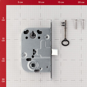 замок, 2 винта по дереву, 1 ключ. Ответная планка в комплект не входит.