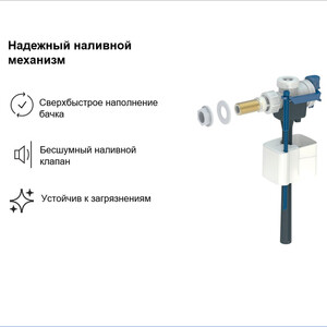 Угловой запорный вентиль R 1/2", совместим с MF, с кольцом-адаптером, защитная крышка для окна технического обслуживания из пенополистирола, 2 держателя крепления рамки, комплект для подключения унитаза ø 90 мм, соединительное колено 90° из ПНД ø 90 мм, переходная муфта из ПНД ø 90/110 мм, 2 защитных заглушки, 2 резьбовые шпильки M12, крепеж.