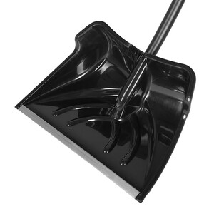 Лопата для уборки снега. Ковш изготовлен из пластика с компонентами для повышения прочности при ударах и морозах до – 25˚С. Ковш выполнен в черном цвете. На ковше снизу рабочей части установлена защитная планка из алюминия. Лопата изготовлена с эргономически изогнутым черенком длиной 1,1 метра из алюминиевой трубы Ø 32 мм х 1,2 мм с порошково-полимерным покрытием черного цвета.